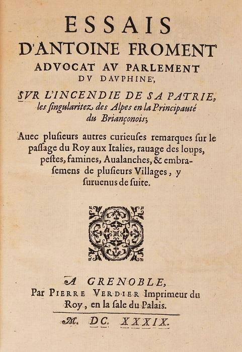 En 1639, Antoine Froment, Briançonnais, avocat au parlement du Dauphiné publie un ouvrage relatant l’incendie qui a ravagé la ville de Briançon en 1624, sous le titre « les essais d’Antoine Froment sur l’incendie de sa patrie ». Jugé singulier par les historiens locaux en raison de la complexité de son style, l’ouvrage restera dans l’histoire locale au rang de curiosité. Toutefois, outre la description des méthodes de lutte contre le feu, c’est la pertinence des réflexions sur l’incendie urbain et les comportements face au sinistre qui rendent l’essai remarquable. Contre toute attente pour un écrit de cette époque, la relation démontre également l’acuité remarquable de l’auteur, témoin et sinistré, face à un désastre dont il décrit des phénomènes qui ne seront mis en évidence qu’entre le 18e et le 20e siècle.
